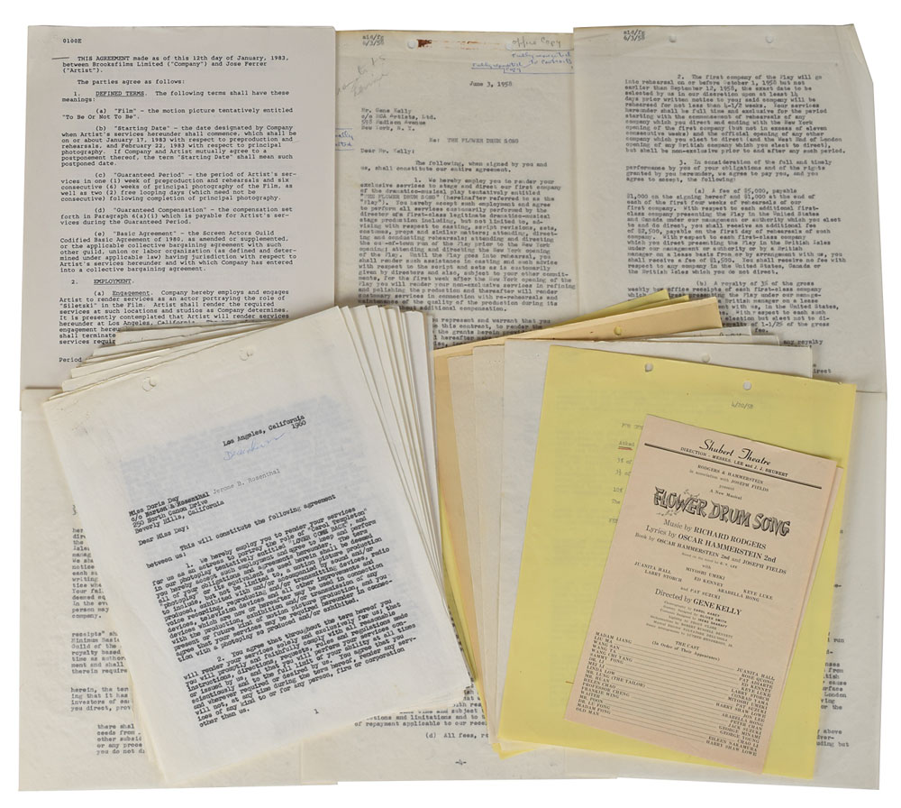 Assortment of five documents signed by Hollywood notables, dated from 1952 to 1983, including: Doris Day, Dino De Laurentiis, Jose Ferrer, Gene Kelly, and Tyrone Power. In overall fine condition. Day signs her initials twice on an accompanying rider.