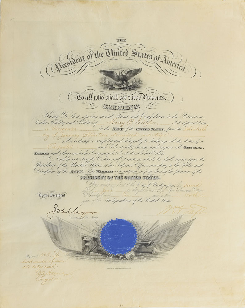 Partly-printed vellum DS as president, signed “Wm. H. Taft,” one page, 15.25 x 19, June 2, 1910. President Taft appoints Harry R. Taylor as "a Carpenter in the Navy of the United States." Signed at the conclusion by Taft, and countersigned by Secretary of the Navy George von L. Meyer. Blue Navy Department seal remains affixed to lower vignette. In fine condition, with scattered light creasing, and Taft's signature a couple of shades light.
