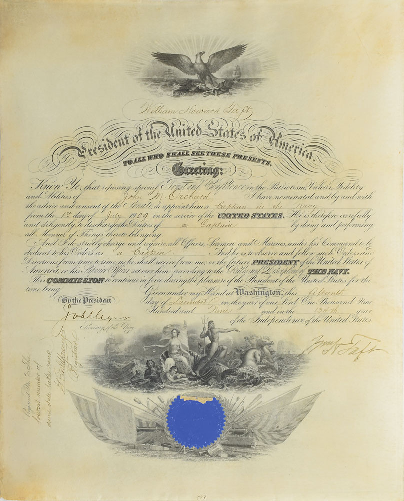 Partly-printed vellum DS as president, signed “Wm. H. Taft,” one page, 15.5 x 19.25, December 15, 1909. President Taft appoints John M. Orchard as a "Captain in the Navy." Signed at the conclusion by Taft, and countersigned by Secretary of the Navy George von L. Meyer. Blue Navy Department seal affixed to lower vignette remains partially intact. In fine condition, with areas of light toning.