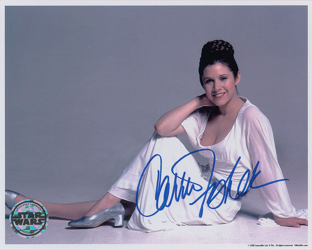 Color semi-glossy 10 x 8 full-length photo of Fisher as a lounging Princess Leia Organa, signed in blue felt tip. Lower left corner bears an affixed Official Star Wars label. In fine condition.