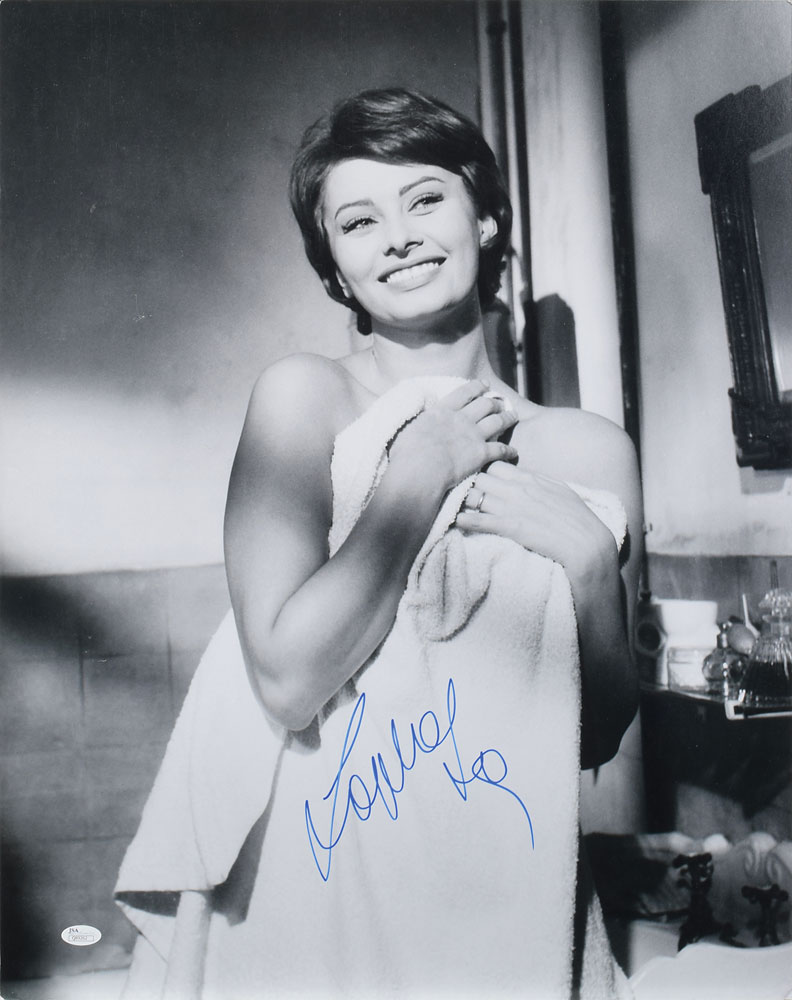 Delightful pair of oversized semi-glossy photos of Sophia Loren, 20 x 24 and 19.75 x 25, both signed in blue felt tip. Both are mounted to same-size pieces of foamcore and in overall fine condition. Both are accompanied by certificates of authenticity from JSA.