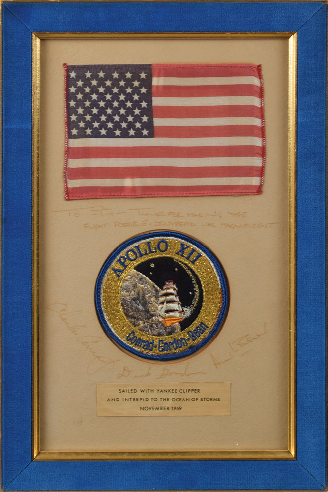 Lunar flown fabric American flag carried to the moon on the Apollo 12 mission, 6 x 4, affixed to an off-white 7.25 x 12.5 mat, signed and inscribed on the mat in black ink, "To Jim—Thanks for making the flight possible—Intrepid was magnificent, Alan L. Bean," "Dick Gordon," and "Charles Conrad, Jr." Mounted and framed with an embroidered mission patch and a caption reading, "Sailed with Yankee Clipper and Intrepid to the Ocean of Storms, November 1969," to an overall size of 9.75 x 14.75. In fine condition, with all of the handwriting faded but easily legible. James F. Harrington joined the NASA team in 1966, as Senior Test Supervisor on Apollo 6, 9, 12, and 15, and later became the Shuttle Launch Director of the Kennedy Space Center on January 22, 1995.