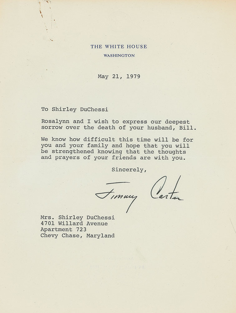 TLS as president, one page, 6.75 x 8.75, White House letterhead, May 21, 1979. Letter to Shirley DuChessi, in full: “Rosalynn and I wish to express our deepest sorrow over the death of your husband, Bill. We know how difficult this time will be for you and your family and hope that you will be strengthened knowing that the thoughts and prayers of your friends are with you.” A rusty paperclip impression to the upper left, otherwise fine condition. Accompanied by the original White House mailing envelope. Bill DuChessi was a leader of the Textile Workers Union of America.
