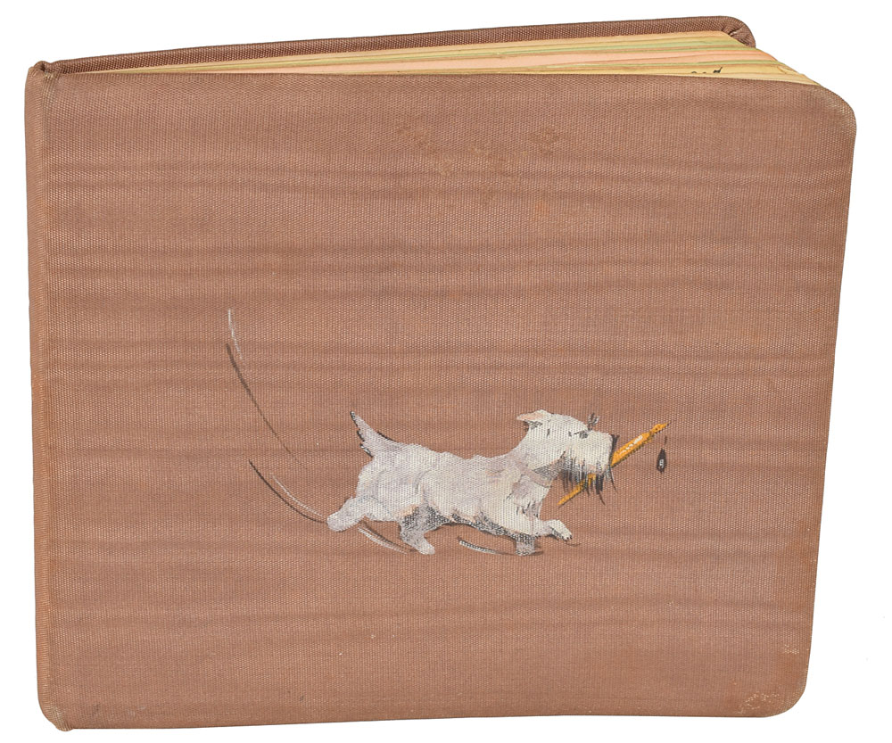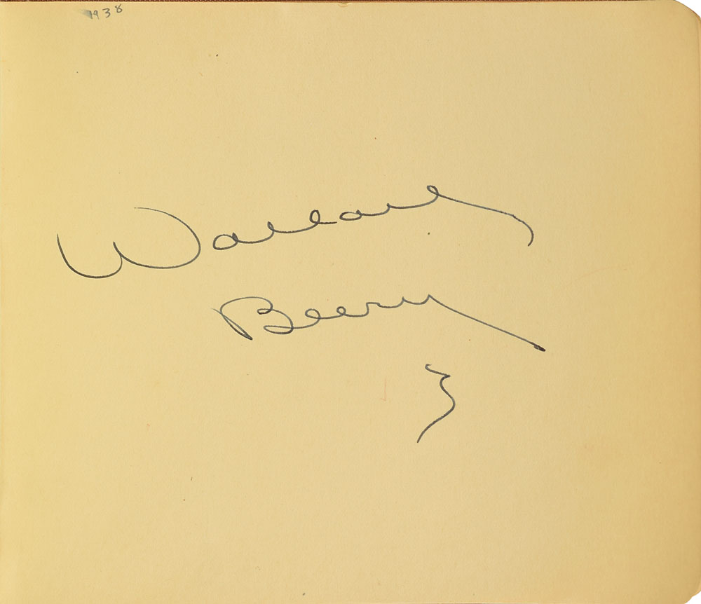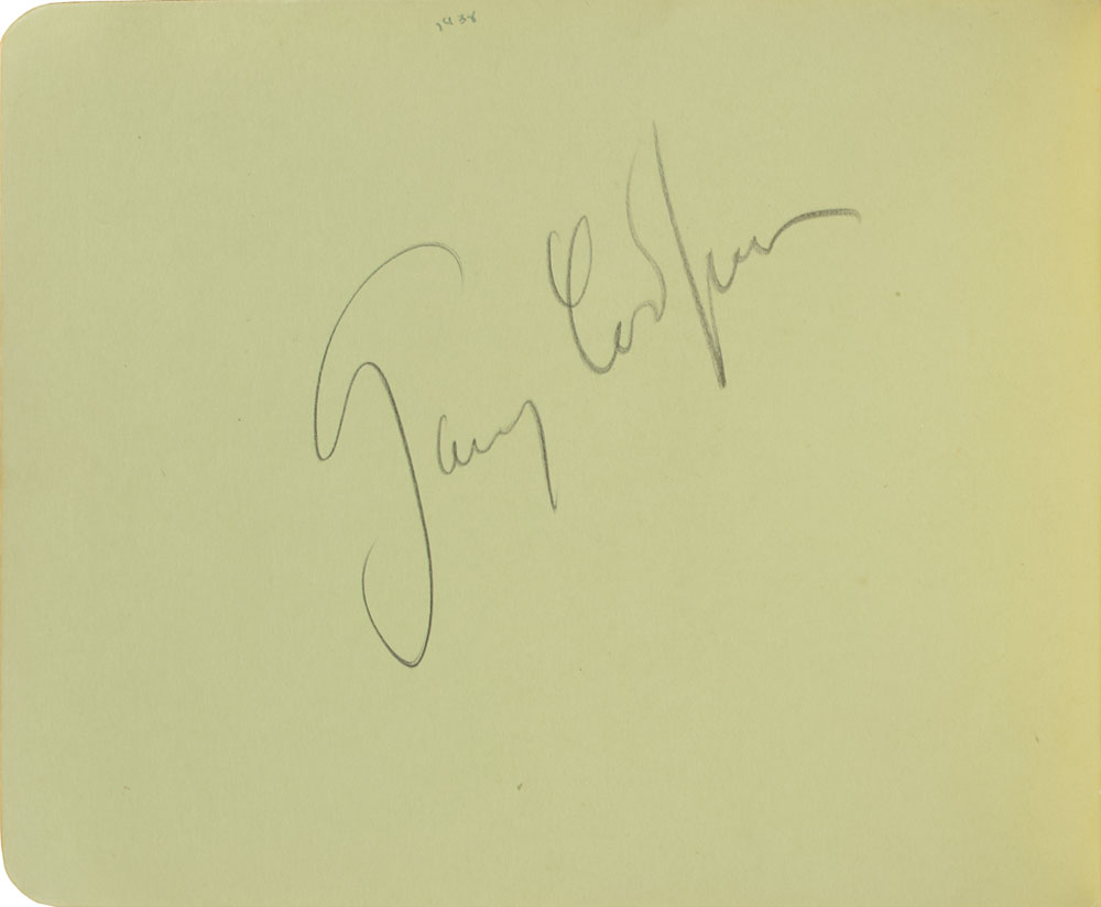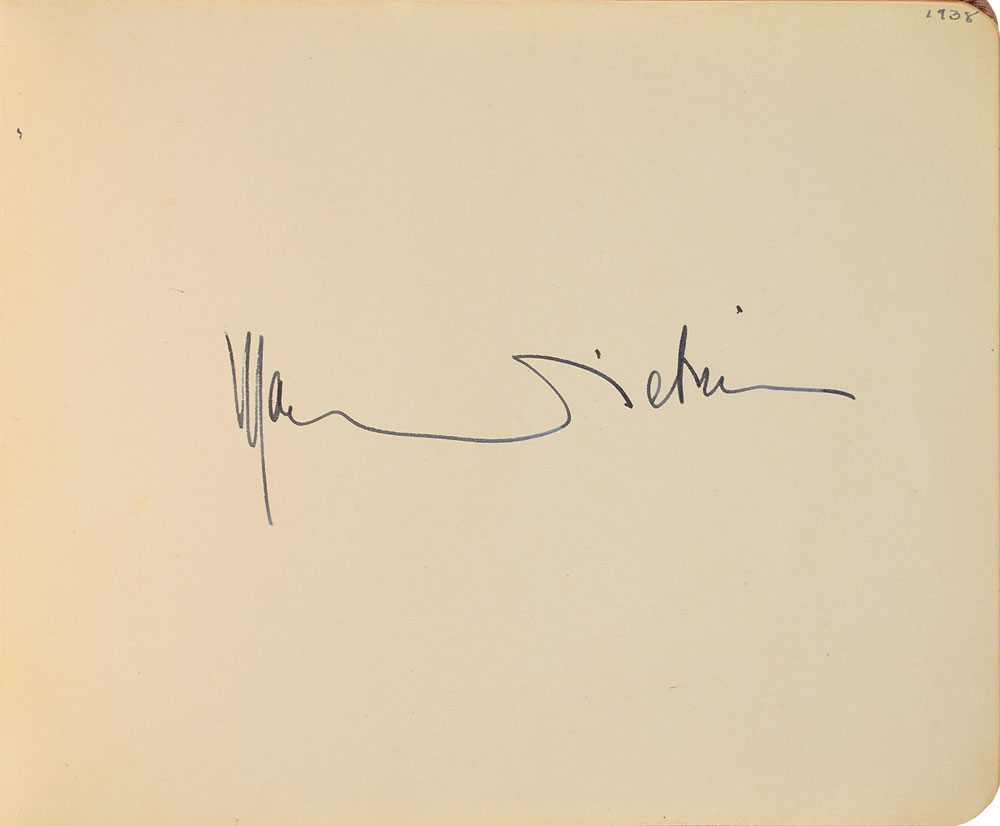 Softcover autograph book, 6 x 5.25, signed inside by over 60 stars of vintage Hollywood, some signatures clipped and affixed, with many inscribed to Patricia. Signers include: Mary Astor, Sid Grauman, Loretta Young, Simone Simon, Marlene Dietrich, Gary Cooper, Wallace Beery, Barbara Stanwyck, Bruce Cabot, Mickey Rooney, John Garfield, Bob Hope, and Bing Crosby. In very good to fine condition.