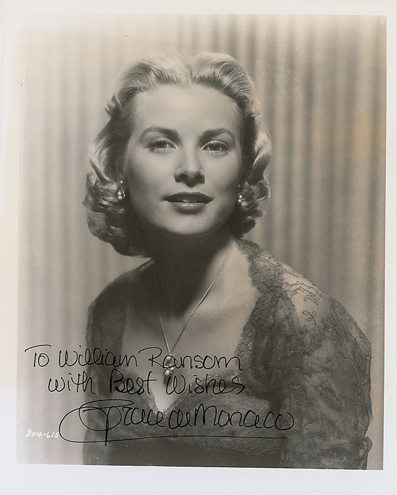 Glossy 8 x 10 photo of Kelly in a sheer blouse, signed and inscribed in black felt tip, “To William Ransom, with best wishes, Grace de Monaco.” In very good to fine condition, with creasing to lower portion, toning, surface impressions, and a small repaired tear to the lower border.