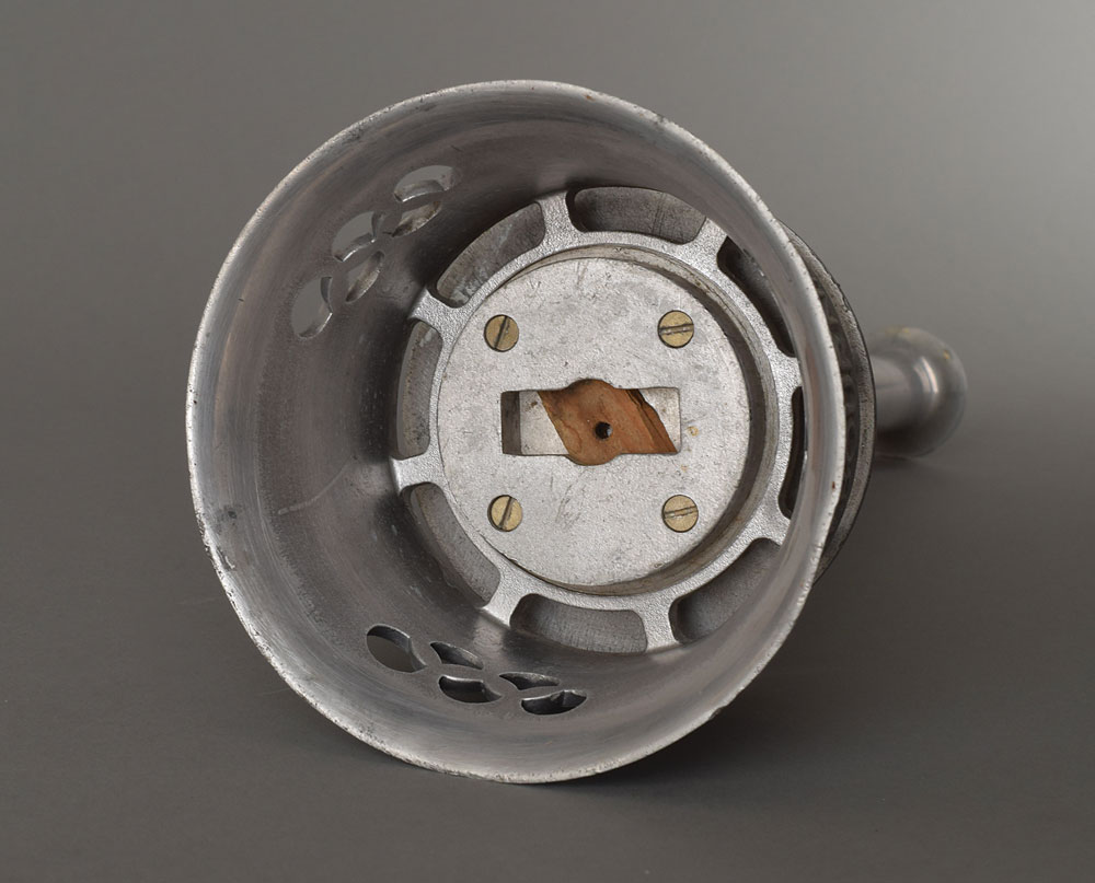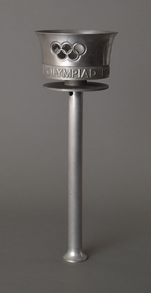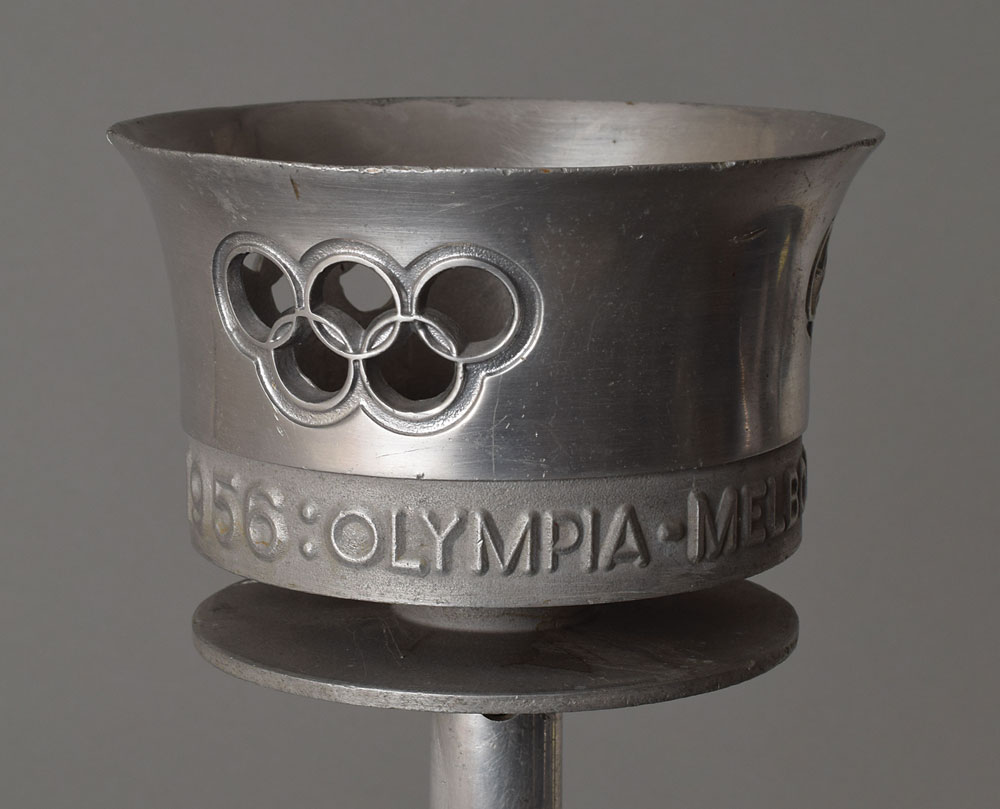 Official 1956 Melbourne Olympics torch, comprised of aluminum alloy, measuring 16″ in length and 5.5″ at its widest point, designed by Ralph Lavers and manufactured by Waco Ltd. The torch was modeled after the one used for the 1948 London Olympics, with the upper part in the shape of a cauldron with three 'cut-outs' of the Olympic rings, encircled below by the inscription, "XVI Olympiad 1956: Olympia-Melbourne." Burner is absent. After its lighting in Olympia on November 2, 1956, the flame made its way through the Middle East and South Asia en route to Australia, where the relay ended at the opening ceremony on November 22. All together, the flame was carried by 3,181 torchbearers over 4,912 km on land. An iconic torch from the first Games to be held outside Europe or North America.