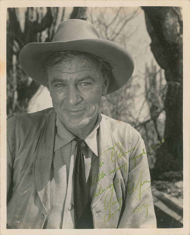 Vintage matte-finish 8 x 10 photo of Cooper as Benjamin Trane from the 1954 film Vera Cruz, signed and inscribed in green fountain pen, "To Chris, with many good wishes always, Gary Cooper, 1954.” In very good to fine condition, with scattered creasing and old adhesive residue on the reverse.