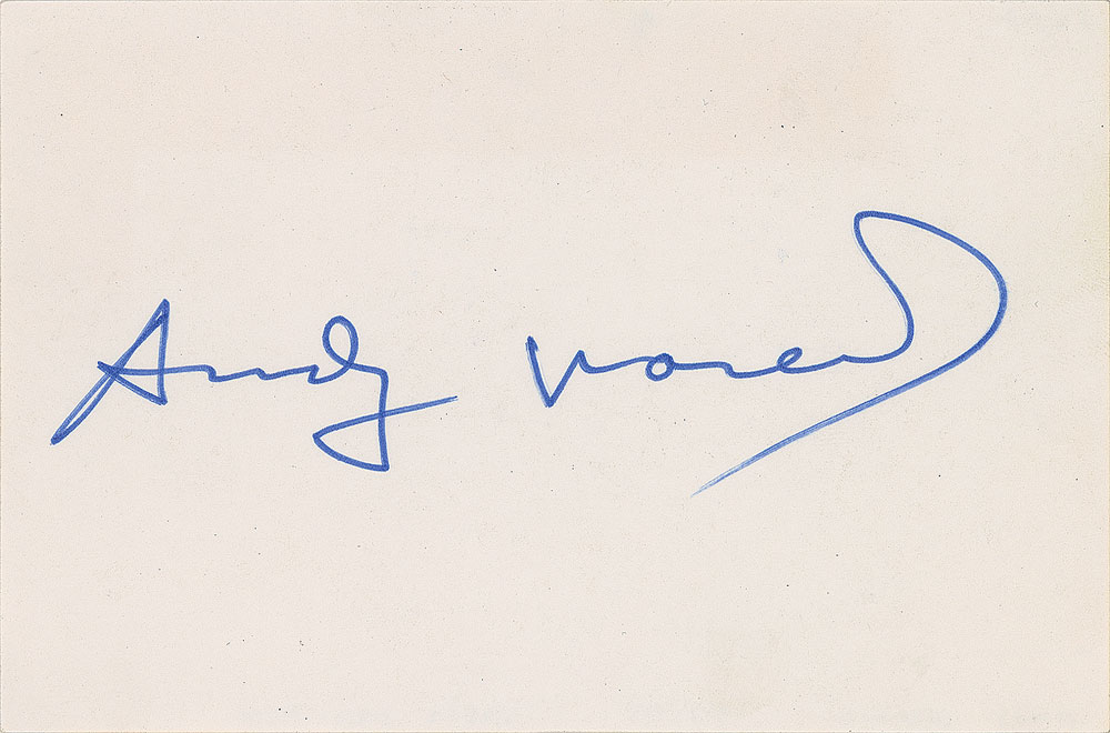 Felt tip signature, "Andy Warhol,” on an off-white 6 x 4 card. Reverse bears a collector's notation, "3/25/85, Spago's Oscar Party." In fine condition. From the Harvey and Rhoda Kuflik Collection.