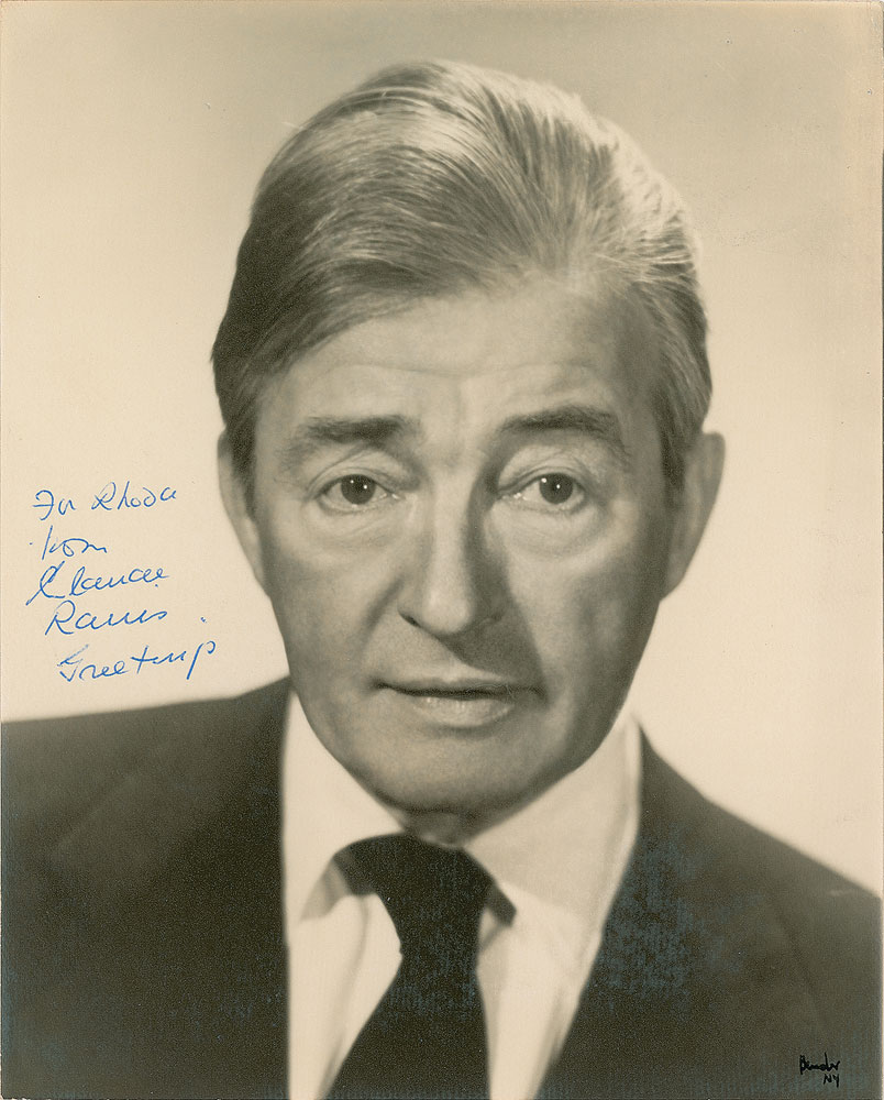 Handsome matte-finish 8 x 10 photo of Rains in a suit and tie, signed and inscribed in blue ballpoint, "For Rhoda, from Claude Rains, Greetings.” In fine condition. From the Harvey and Rhoda Kuflik Collection.