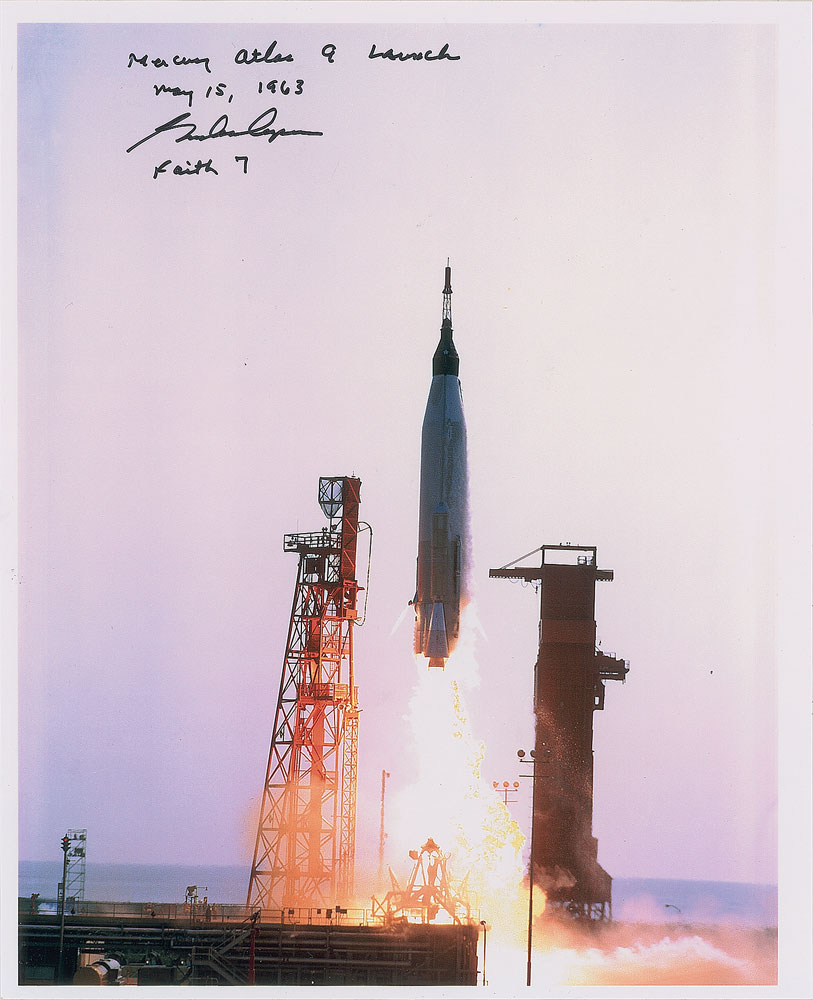 Gorgeous color satin-finish 8 x 10 photo of a Mercury Project rocket launch, signed in black felt tip, "Mercury Atlas 9 launch, May 15, 1963, Gordon Cooper, Faith 7." In fine condition.