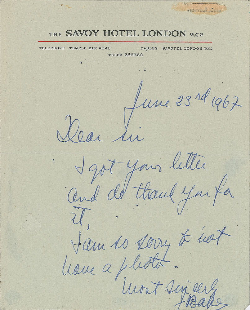 ALS signed “J. Baker,” one page, 6.25 x 7.75, The Savoy Hotel letterhead, June 23, 1967. In full: "I got your letter and do thank you for it. I am so sorry to not have a photo." In fine condition, with an old clipping remnant at the tope edge. Baker remains quite scarce in handwritten letters, this being just our third in the past five years.