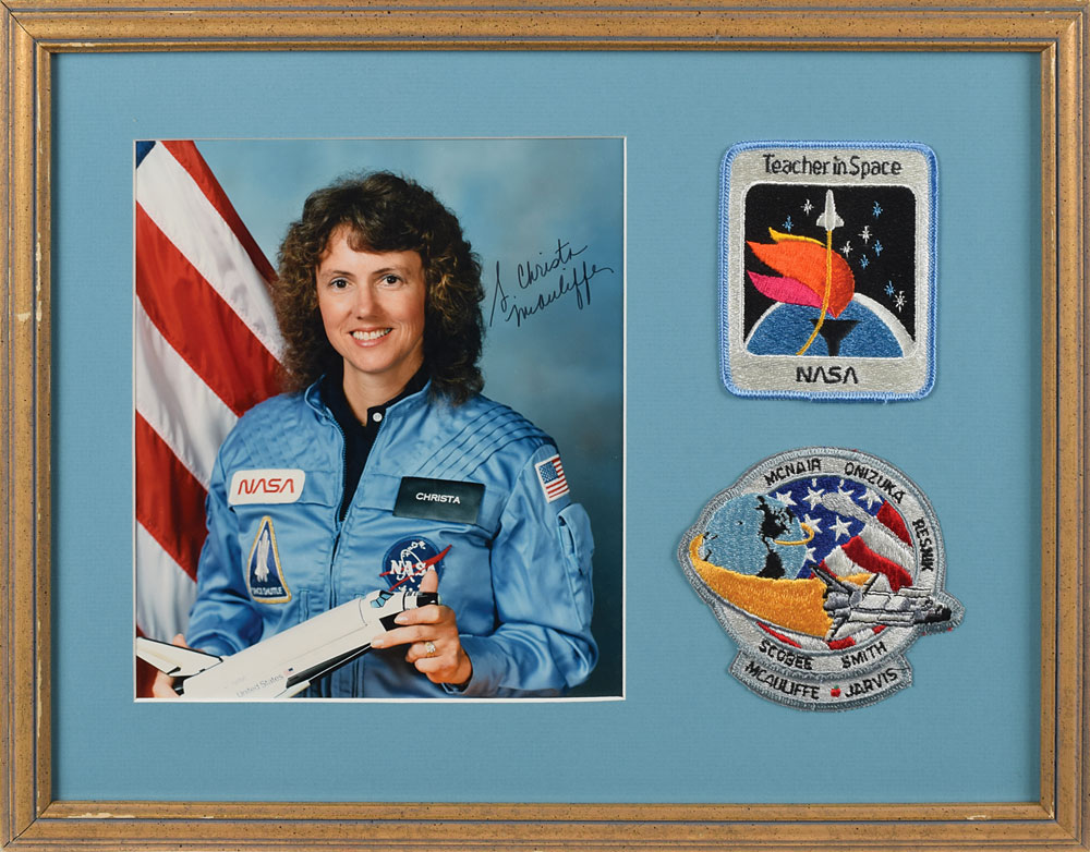 Color semi-glossy 7.5 x 8.75 photo of McAuliffe wearing her blue flight suit and holding a model of the Space Shuttle Orbiter, signed in black felt tip, "S. Christa McAuliffe." Matted and framed with embroidered patches for the Teacher in Space program and for the STS-51-L mission to an overall size of 16.75 x 13.25. In fine condition.