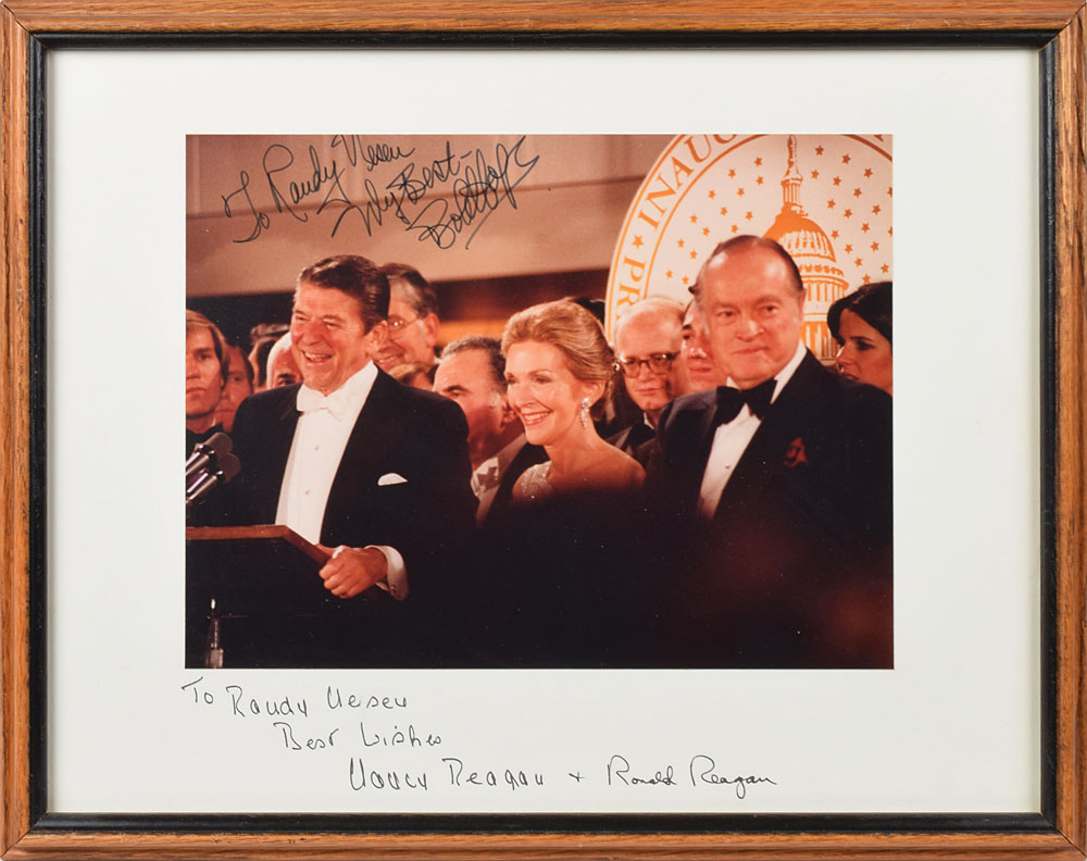 Color satin-finish 9.75 x 7.5 photo of President Reagan, the first lady, and Bob Hope at the Kennedy Center Inaugural Ball in 1981, affixed to the original 13.5 x 10.75 mount, signed and inscribed on the mount in thin black felt tip, "To Randy Nesen, Best Wishes, Nancy Reagan" and "Ronald Reagan." Also signed and inscribed on the photo in black felt tip, "To Randy Nesen, My best—Bob Hope." Framed and in fine condition.