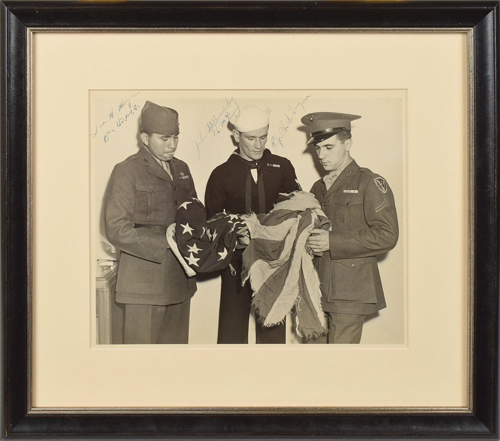 Vintage matte-finish 9.75 x 7.75 photo of three of the men who helped raise an American flag atop Iwo Jima's Mount Suribachi, showing the soldiers holding and examining the tattered second flag, signed in fountain pen by all three: “Ira H. Hayes, Pfc., U.S.M.C.,” “John H. Bradley, Ph. M. 2/c,” and “Pfc. R. A. Gagnon.” Archivally matted and framed to an overall size of 15.25 x 13.5. In fine condition. Bradley, Gagnon, and Hayes were three of several US soldiers who planted two US flags atop Mount Suribachi on the Japanese island of Iwo Jima on February 23, 1945. Although often credited as a member of the second flag-raising, an event famously captured on film by photographer Joe Rosenthal, Bradley was in fact involved with the first raising of the American flag by the 2nd Battalion. When President Franklin D. Roosevelt ordered the surviving Rosenthal photo soldiers to Washington, D. C. to participate in the 7th War Bond Drive, Bradley was erroneously selected over United States Marine Corporal Harold Schultz to attend. The trio toured the nation for two months with the American flag and raised over $26 billion, twice the original goal. A phenomenal union of three unlikely heroes who, along with their fallen comrades, became the collective ‘face’ of World War II.