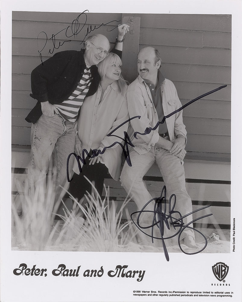 Glossy 8 x 10 Warner Bros. Records promotional photo, signed in black felt tip by Peter Yarrow, Noel Stuckey, and Mary Travers. In fine condition. Accompanied by a full letter of authenticity from REAL.