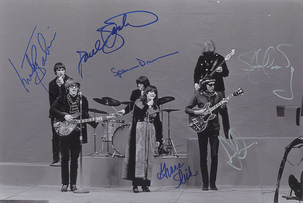 Glossy 15 x 10 photo of Jefferson Airplane performing, signed in blue felt tip by Marty Balin, Grace Slick, Spencer Dryden, and Paul Kantner, and in silver ink by Jack Casady and Jorma Kaukonen. In fine condition. Accompanied by full letters of authenticity from REAL and Beckett Authentication Services.