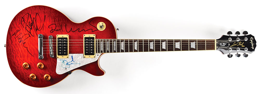 Eye-catching Epiphone Les Paul Classic electric guitar with a handsome quilted bourbon finish, signed on the body in felt tip by Rick Wright, Nick Mason, and Roger Waters, and on the mother-of-pearl pickguard in felt tip by David Gilmour. In fine condition, with partial fading to the Gilmour signature. A beautiful instrument signed by the legendary rock band. Accompanied by full letters of authenticity from REAL and Beckett Authentication Services.