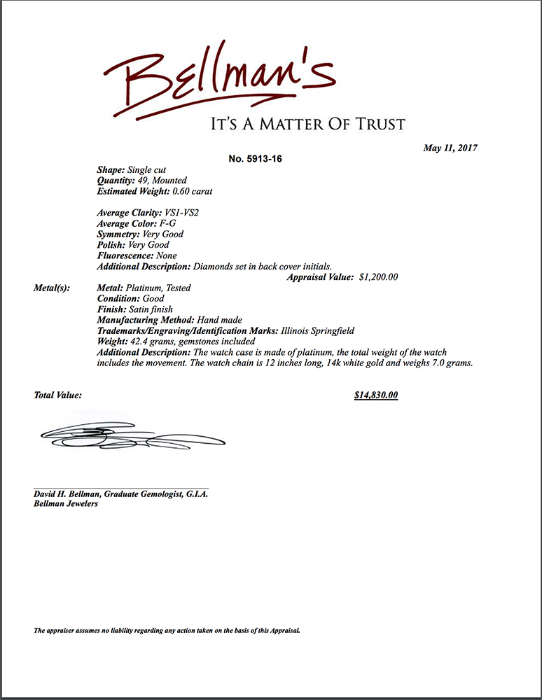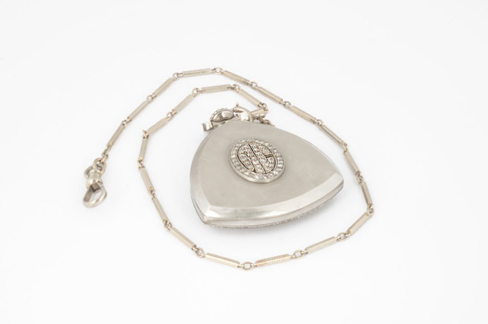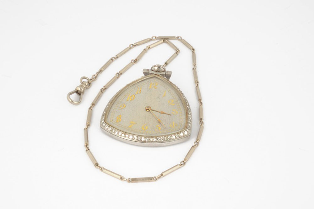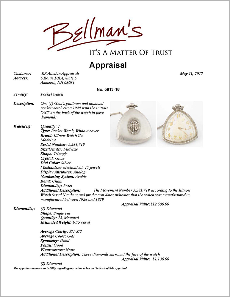 Al Capone's personally-owned and -used platinum rounded triangular pocket watch made by the Illinois Watch Company, measuring approximately 1.5 x 1.75, with the circumference of front bezel set with a series of seventy-two cut diamonds, a platinum face, and gold-tone impressed numerals and watch hands; the reverse of the case bears the initials "AC," which consists of twenty-three cut diamonds, and is encircled by twenty-six more. The interior of the case is marked "Illinois Watch, Springfield," with serial no. 5281719, and it contains a 17-jewel movement with gold wheels and jewel cups; the serial number indicates that the watch was manufactured between 1928 and 1929. Includes the original 12″ watch chain made of 14K white gold. In fine condition.