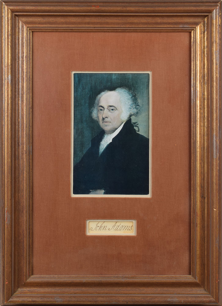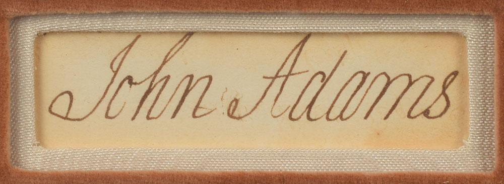 Highly sought-after large ink signature, "John Adams,” on an off-white 3.5 x 1 sheet. Double-cloth-matted and framed with a portrait to an overall size of 18 x 25. In fine condition. An impressive and crisp signature from the scarce founding father.