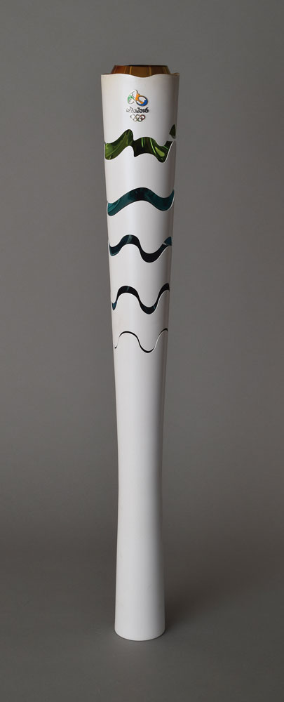 Official 2016 Rio de Janeiro Summer Olympics torch used during the Olympic relay, constructed of recycled aluminum and colored resin, measuring 27″ in length and 3.5″ at its widest point, designed by Sao Paulo studio Chelles & Hayashi and manufactured by Recam Laser. The torch features a white body that automatically expands upon being lit to reveal multicolored segments drawn from the hues of the Brazilian flag, representing the natural wonders surrounding the host city. The Rio Olympic emblem also adorns the top. Includes the original brown drawstring carrying bag, tube, display stand, and official Rio 2016 memorabilia folder, which includes a certificate of authenticity.
