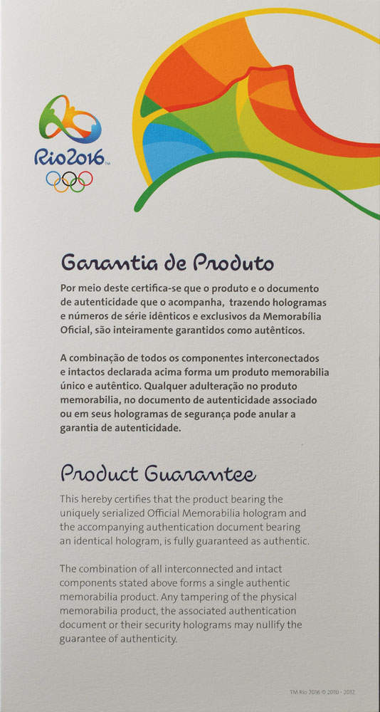 The torch relay began in Olympia on April 21, and concluded on August 5 at Maracanã Stadium in Rio de Janiero, after visiting over three hundred of Brazil’s towns and cities. A record number of countries participated in the Rio Games, including first time entrants Kosovo and South Sudan. Ten thousand and nine hundred athletes participated in 306 medal events in 45 sports disciplines. A rare opportunity to own a certified relay torch from the most recent Olympic games.