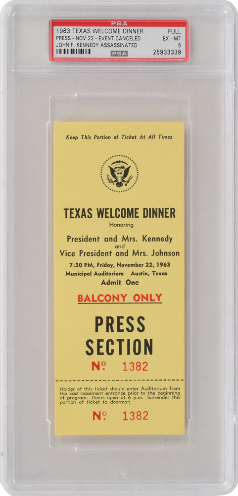 Unused original "Press Section, Balcony Only" ticket, number 1382, 2.5 x 6, to the 'Texas Welcome Dinner' presented in honor of President John F. Kennedy and Vice President Lyndon B. Johnson, to be held at the Municipal Auditorium in Austin at 7:30 PM on November 22, 1963. Encapsulated in a plastic PSA/DNA authentication and grading holder, evaluating the ticket as "EX-MT 6." In very fine condition. Scheduled to occur on the night of Kennedy's assassination, this dinner would never take place.