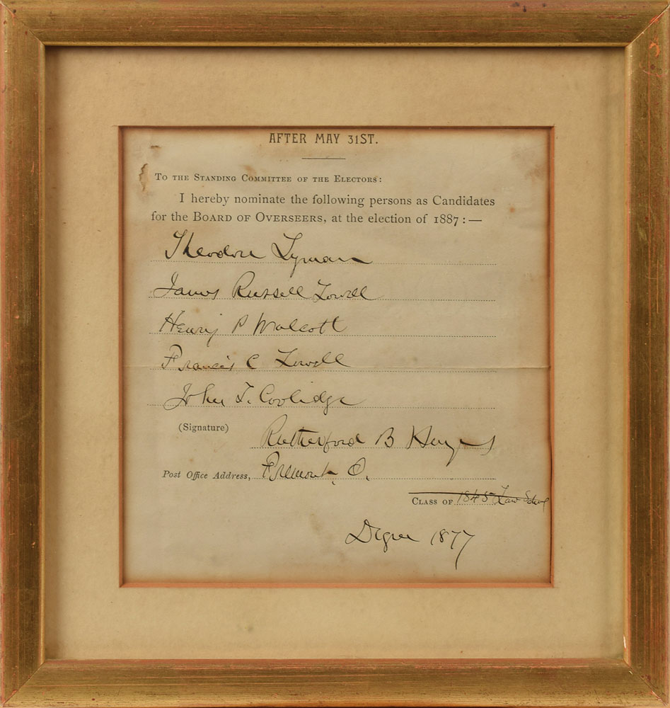 Partly-printed DS, one page, 5 x 5.25, dated 1887. Issued to the Standing Committee of the Electors, Hayes has signed and filled out a nomination form for the Board of Overseers of Harvard University, on which he lists the names of his nominations: "Theodore Lyman, James Russell Lowell, Henry P. Walcott, Francis C. Lowell, John J. Coolidge." Signed at the conclusion, "Rutherford B. Hayes, Freemont, O.," with Hayes striking through "Class of 1845 Law School" and adding "Degree 1877," the first year of his presidency. Matted, framed, and in very good to fine condition, with a bit of paper loss to the upper left corner and light toning to the perimeter.