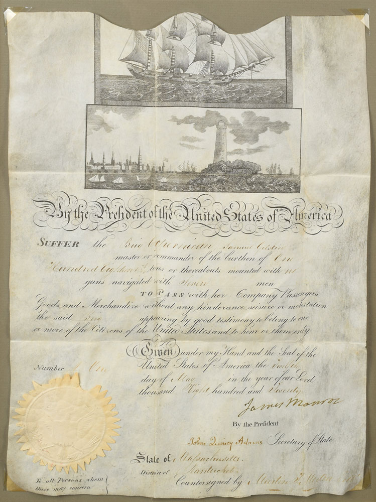 Partly-printed vellum DS, signed “James Monroe" as president and "John Quincy Adams" as secretary of state, one page, 10 x 14.5, May 12, 1870. Scallop-topped ship's pass issued for "the Brig Copernican, Samuel Gelston master or commander…navigated with seven men to Pass with her Company, Passengers, Goods and Merchandize without any hinderance, seisure or molestation." Nicely signed at the conclusion by Monroe and countersigned by Adams. The white paper seal remains affixed to the lower left. Mounted, matted, and framed to an overall size of 17 x 21.5. In very good to fine condition, with trimmed edges and moderate intersecting folds.