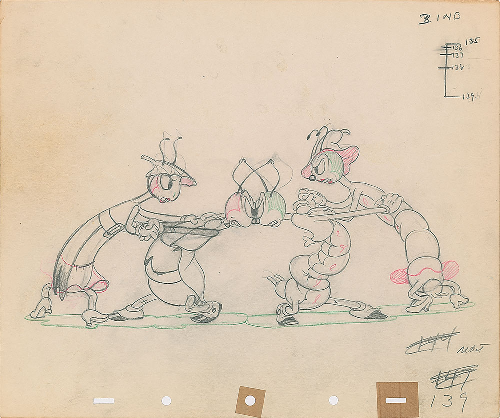 (Walt Disney Studios, 1937) Original production drawing featuring four dancing bugs from Woodland Cafe, showing them in a rather feisty dance-off. Accomplished in graphite and colored pencil on untrimmed 12 x 10 animation paper. Image measures 10.5 x 5. In fine condition. Learn more about our Animation Expert, Harry Kleiman.