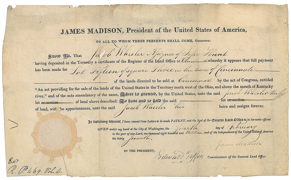 Partly-printed vellum DS as president, one page, 14.75 x 9, February 4, 1813. President Madison grants Jacob Wheeler "Lot Fifteen of square Three in the town of Cincinnati." Signed at the conclusion by President Madison and countersigned by Commissioner of the General Land Office Edward Tiffin. The white paper seal affixed to the lower left remains intact. In very good to fine condition, with several vertical folds, minor loss to edges, a small hole to the recipient's first name, and Madison's signature light but legible.