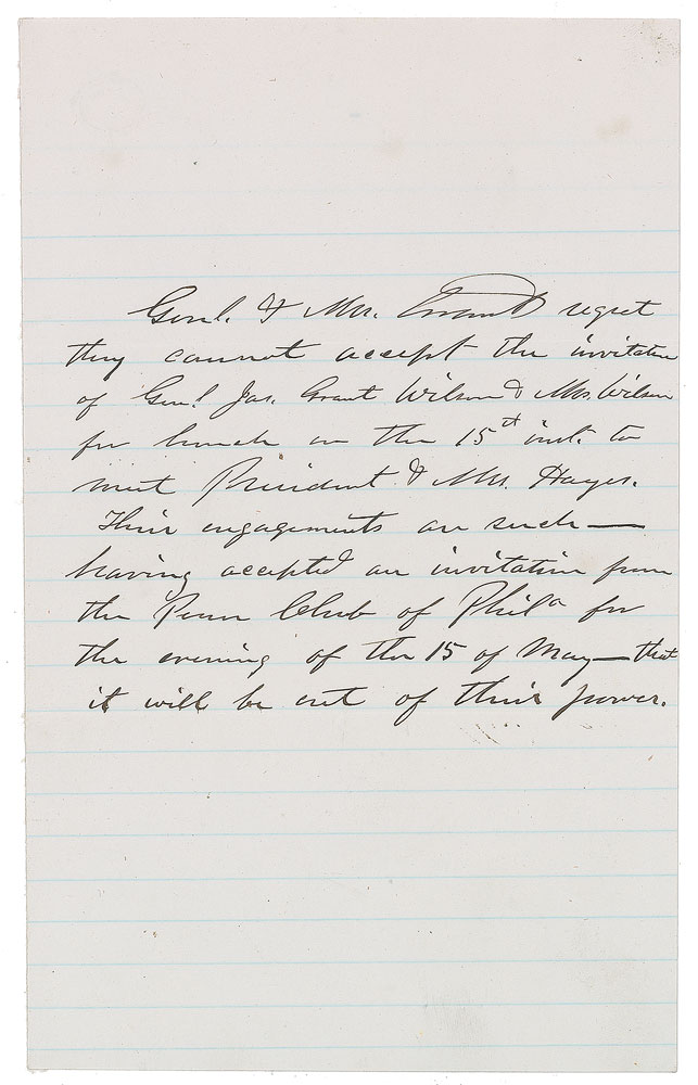 Third-person ALS, signed within the text, “Genl. & Mrs. Grant,” one page, 5 x 8, no date but postmarked August 4, 1884. Letter to General James Grant Wilson, regretfully declining an invitation to lunch with fellow former president Rutherford B. Hayes, in full: "Genl. & Mrs. Grant regret they cannot accept the invitation of Genl. Jas. Grant Wilson & Mrs. Wilson for lunch on the 15th inst. to meet President & Mrs. Hayes. Their engagements as such—having accepted an invitation from the Penn Club of Phila for the evening of the 15 of May—that it will be out of their power." In fine condition. Accompanied by the original mailing envelope addressed in Grant's hand.