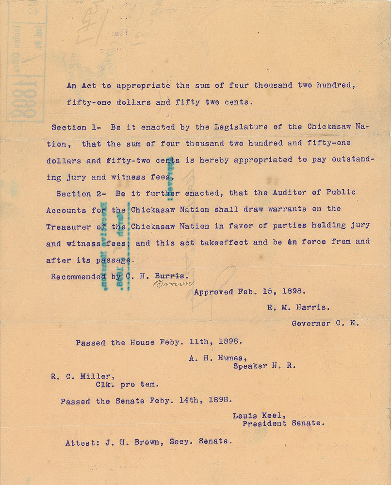Scarce DS as president, one page, 8 x 10, March 8, 1898. Typed copy of a fully executed act by the Chickasaw Nation legislature, entitled "An Act to appropriate the sum of four thousand two hundred, fifty-one dollars and fifty two cents," concerning the disposition of funds for "jury and witness fees," approved on the reverse by President McKinley. In very good to fine condition, with trimmed edges and a thin old strip of mounting tape along one edge. Based on the 1897 Atoka Agreement between the Chickasaw Nation tribe and the US government, the American president was required to approve legislation of this type. An interesting and unusual presidential document.