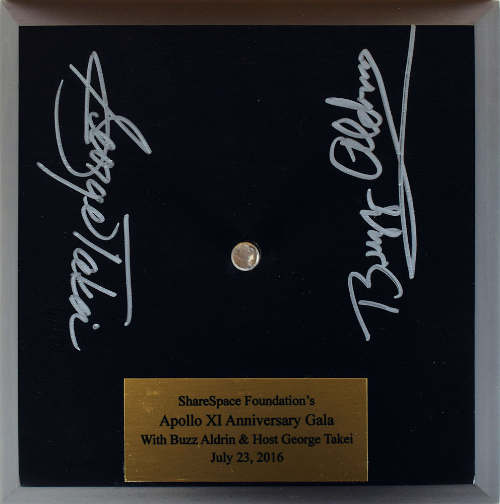 Fantastic 1:48 scale model of an Apollo lunar module set on a black wooden base, measuring 7.25 ″ tall, signed on the base in silver ink by Buzz Aldrin and George Takei. Base bears an affixed plaque reading: "ShareSpace Foundation's Apollo XI Anniversary Gala, with Buzz Aldrin & Host George Takei, July 23, 2016." In fine condition.