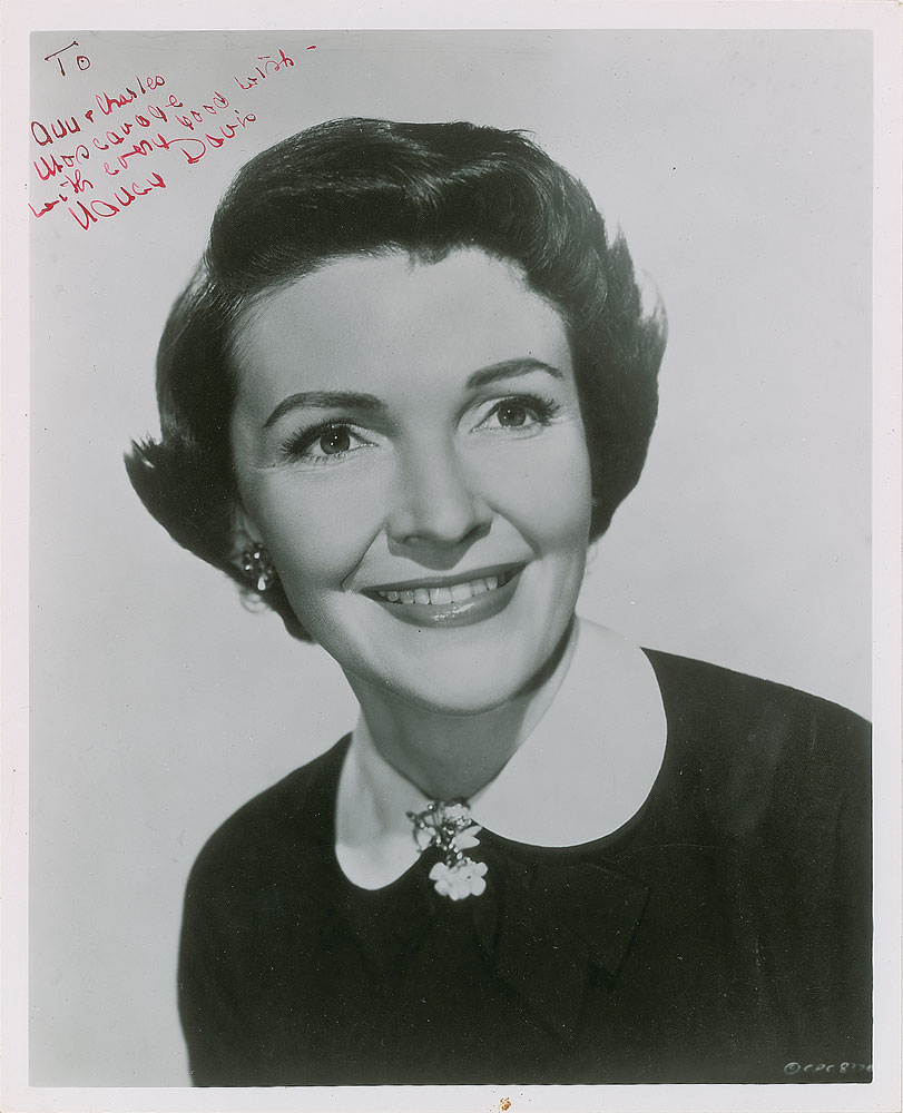 Vintage glossy 8 x 10 photo of the future first lady, signed and inscribed in red fountain pen, "To Ann & Charles…with every good wish—Nancy Davis.” In fine condition.