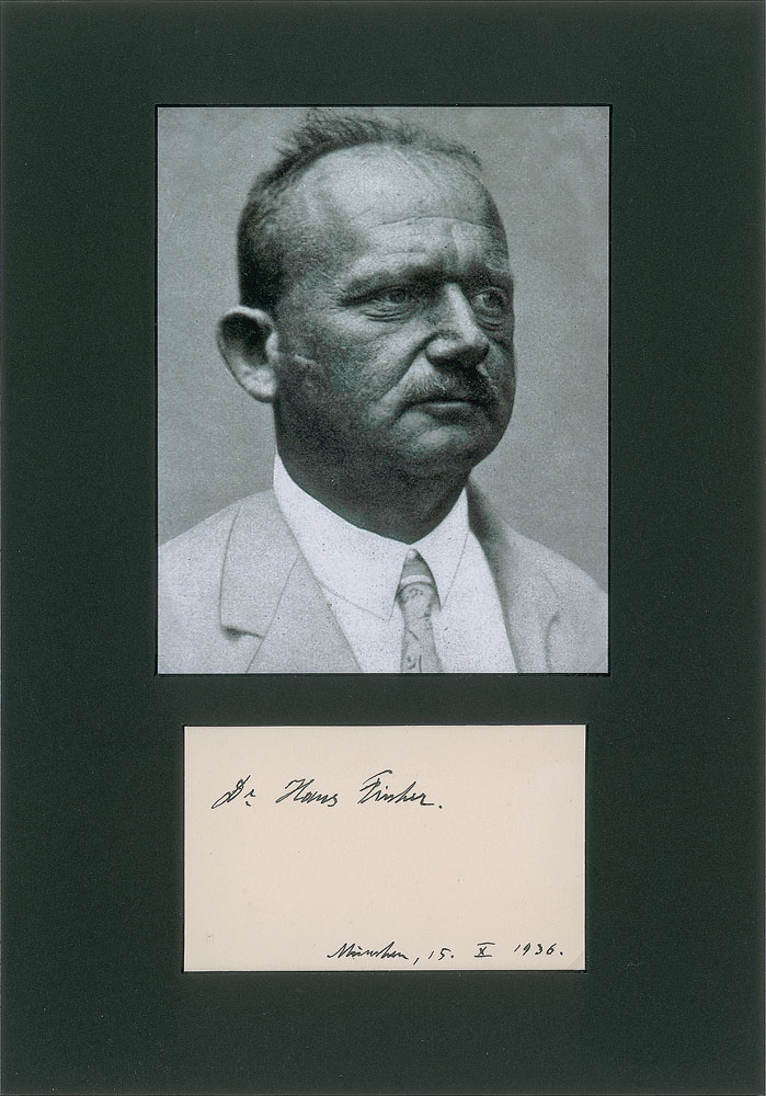 Organic chemist (1881-1945) who received the 1930 Nobel Prize for Chemistry. Ink signature, "Dr. Hans Fischer., Munchen, 15. X 1936,” on an off-white 5 x 3 card. Matted with a modern glossy photo to an overall size of 8.25 x 11.75. In fine condition.