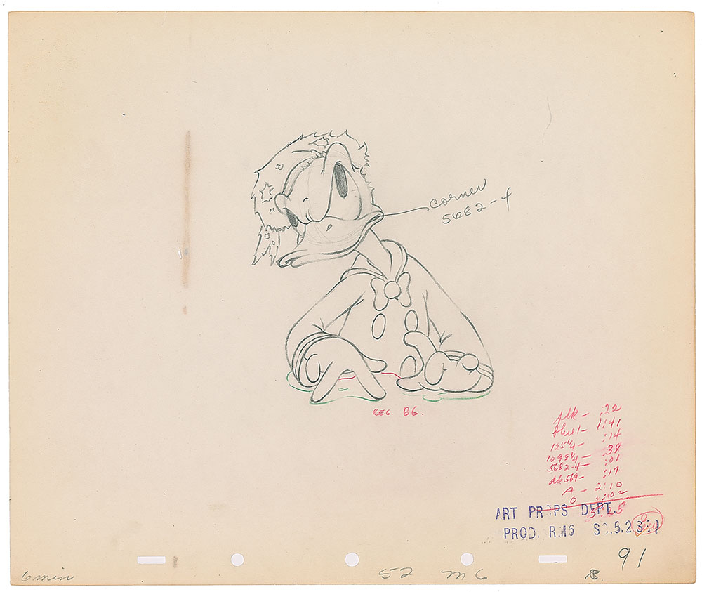 (Walt Disney Studios, 1938) Original production drawing featuring Donald Duck from Self Control, showing him tapping his fingers on the ground. Accomplished in graphite and colored pencil on untrimmed 12 x 10 animation paper. Image measures 4.25 x 5. In fine condition. Learn more about our Animation Expert, Harry Kleiman.