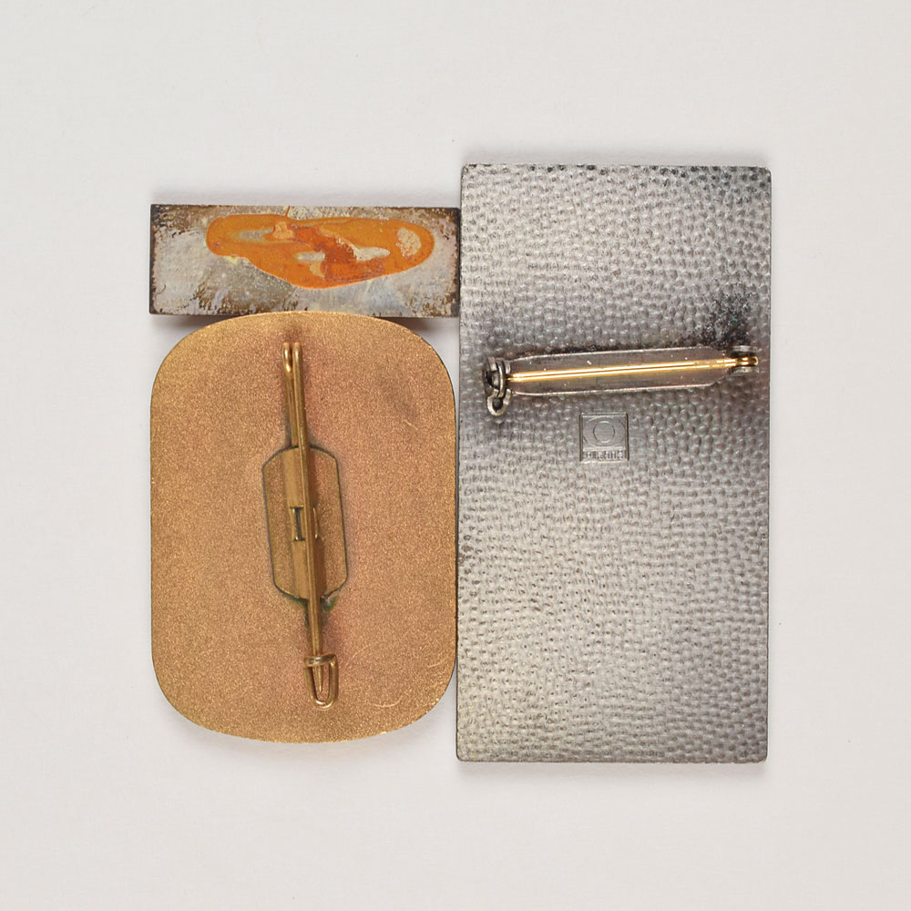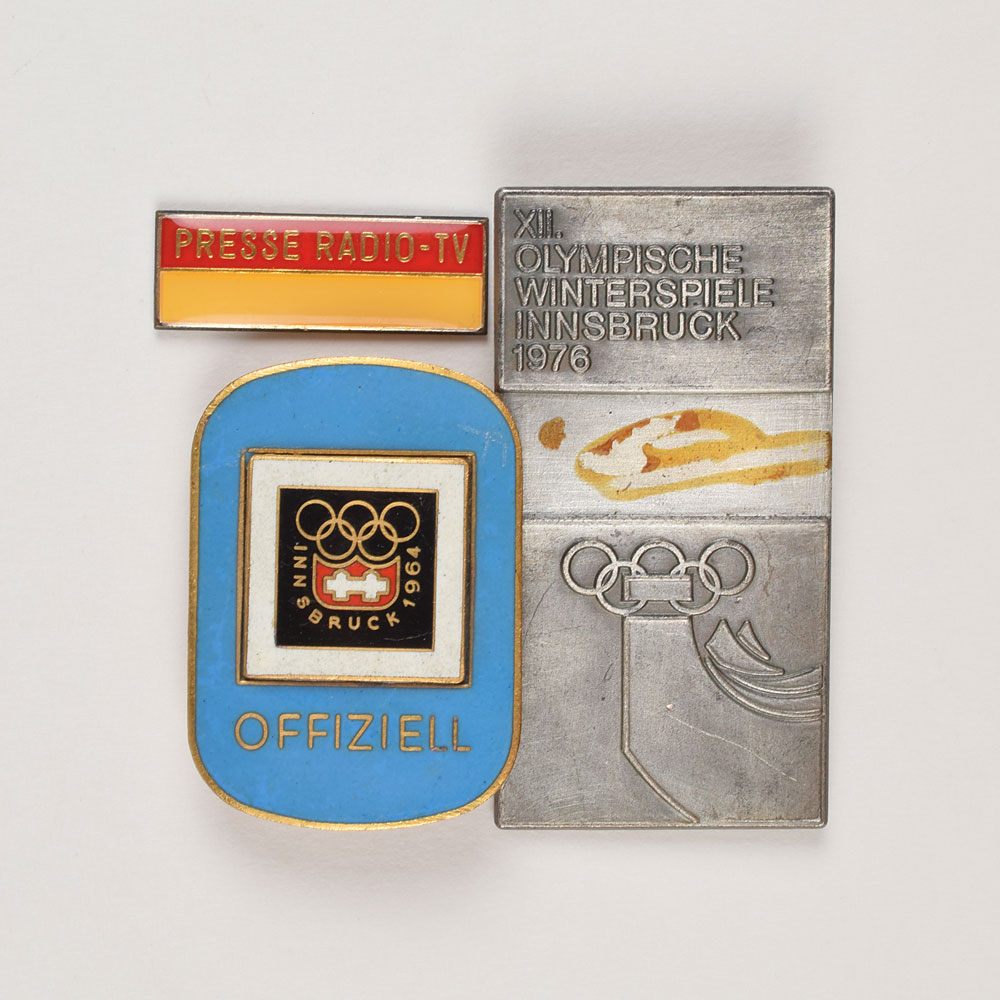 Pair of badges issued for the Innsbruck Winter Olympics of 1964 and 1976: a gold-plated official's badge, 32 mm x 44 mm, 19 gm, featuring an enameled 1964 Winter Olympics logo against a blue background with text, "Offiziell"; and a press badge, 32 mm x 57 mm, 32 gm, featuring raised 1976 Winter Olympics logo and text, "XII. Olympische Winterspiele Innsbruck 1976," and a red-and-yellow enameled bar, "Presse Radio-TV," which has become detached but could be easily reaffixed.