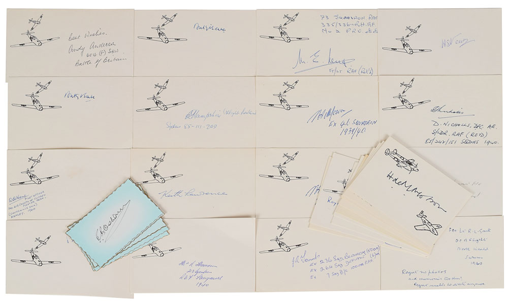 Collection of 31 signatures on individual cards, each signed by a fighter pilot who participated in the Battle of Britain, including: Andy Anderson, R. H. Barber (2), Vaclav Bergman, David Cox, Edward M. Donaldson (3), Fraser Falkiner, C. E. Hampshire, Mike Hedgeland (3), D. H. Hone, Keith Lawrence, Hugh Learmonth, Maurice Long, William J. Madigan, Roy A McGowan (2), Hartland Molson, H. S. Newton, D. Nicholls, R. W. Norris, R. B. Osborn, Paul Patten, R. L. Smith, Freddie Sowrey, Thomas R. Thomson, J. R. Toombs, and Geoffrey Wellum. In overall fine condition.