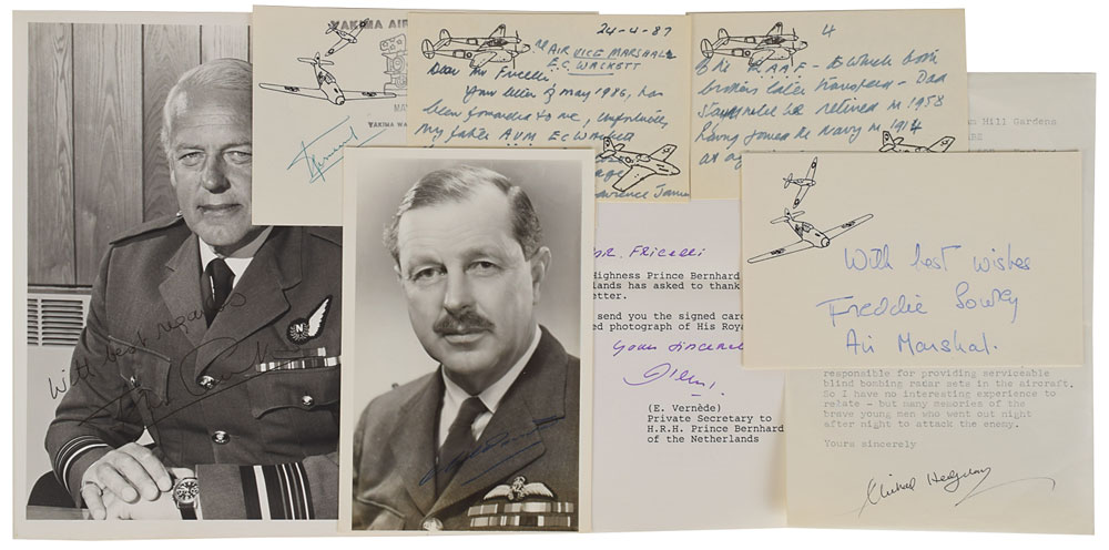 Collection of seven items individually signed by a notable Royal fighter pilot or officer, including: John Curtiss (SP), Prince Bernhardof Lippe-Biesterfeld (signature), Michael Hedgeland (TLS), Ian Morrison (SP), Freddie Sowrey (2 signatures), and E. C. Wackett (ALS). In overall fine condition.