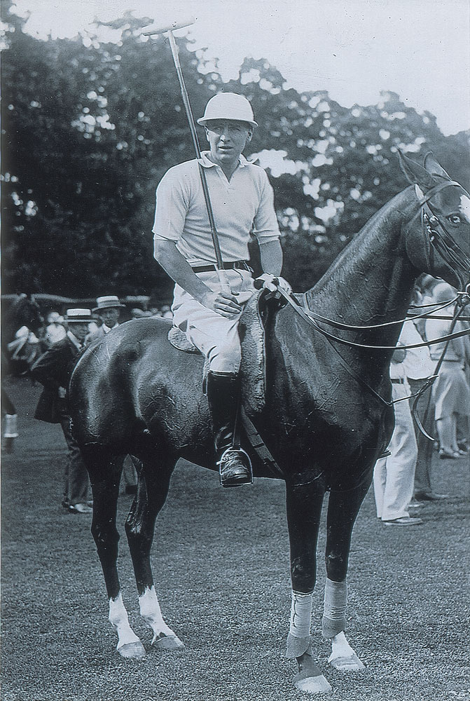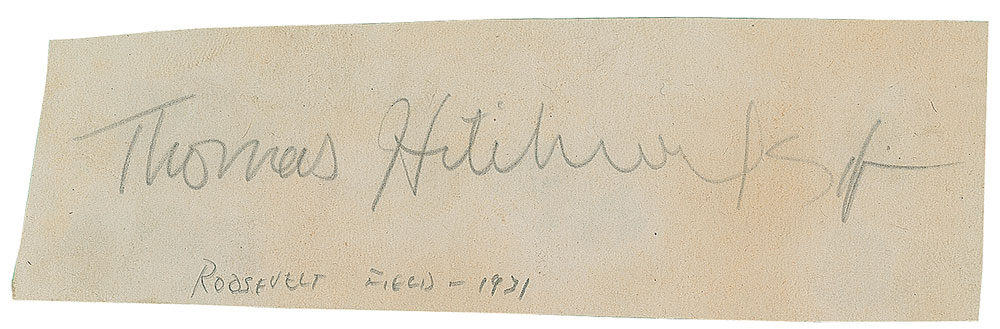 American polo player (1900-1944) who won a silver medal at the Paris 1924 Summer Olympics; he was killed in an air crash during World War II. Pencil signature, "Thomas Hitchcock, Jr.,” on an off-white 4.5 x 1.5 slip affixed to a slightly larger sheet. In very good condition, with irregularly trimmed and permanently affixed, with light toning. Accompanied by a modern 4 x 6 reprint photo of Hitchcock in full gear on his polo pony.