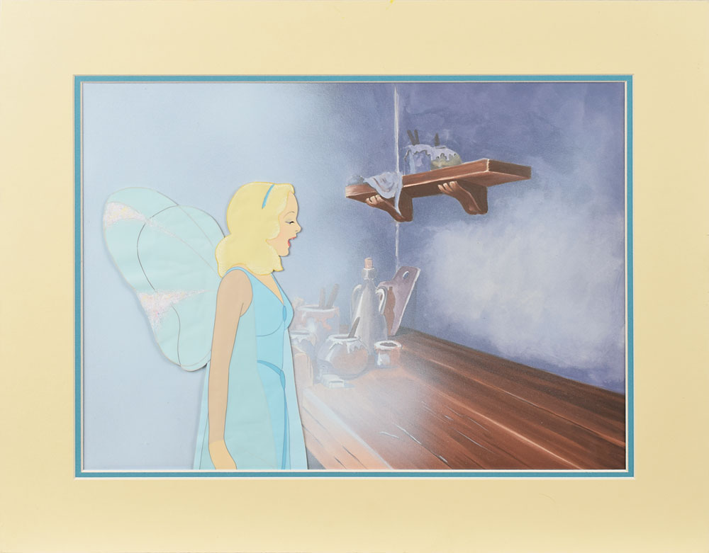 (Walt Disney Studios, 1940) Original production cel featuring the Blue Fairy from Pinocchio, showing the winged magical being at half length. The cel is placed on a detailed modern hand-painted custom prepared background. Image measures 5.25 x 8, with a mat opening of 14.5 x 10.5. Mat dimensions are 19 x 15. In fine condition. A very scarce character from a classic film. Learn more about our Animation Expert, Harry Kleiman.