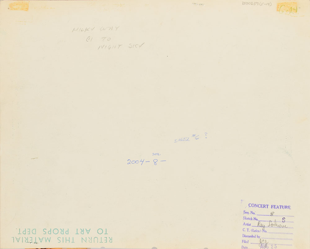 (Walt Disney Studios, 1940) Original production cel and production concept background featuring Mickey Mouse from the 'Sorcerer's Apprentice' sequence of Fantasia, showing Mickey in his full wizard garb against the starry night sky. The cel is placed on a hand-painted production concept background from Fantasia, which bears the appropriate stamps and notations on the reverse. Image measures 4.5 x 7, with overall dimensions of 12 x 9.5. The cel is partially trimmed to 8.5 x 9.5. In fine condition. An absolutely astounding set-up from one of Mickey's most famous scenes. Learn more about our Animation Expert, Harry Kleiman.