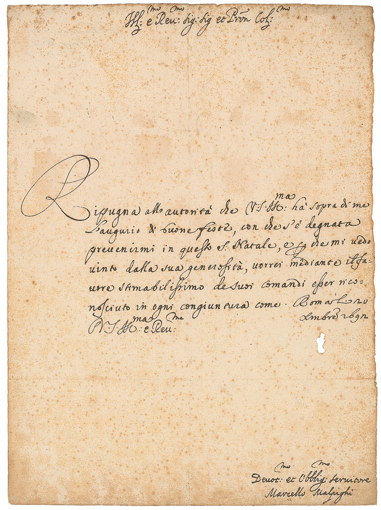 Italian doctor (1628-1694) who gave his name to several physiological features and played an important part in the discovery of the microscope and study of human physiology. Rare LS in Italian, signed (translated), "Your most devoted & obedient servant, Marcello Malpighi," one page, 7.75 x 10.5, December 20, 1692. Malpighi wishes merry Christmas, and renews his friendship and esteem. In very good condition, with moderate overall foxing and toning, and a small hole beneath the text affecting nothing. This is an unpublished letter, absent from the the five-volume Correspondence of Marcello Malpighi published by Cornell University.