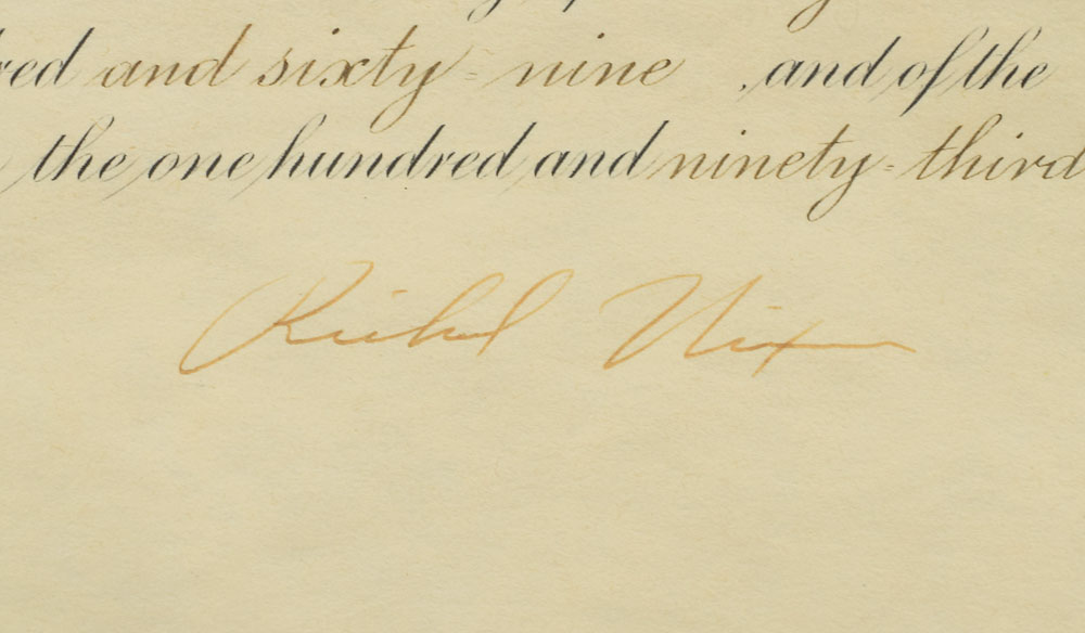 Partly-printed DS as president, one page, 19 x 15, May 6, 1969. President Nixon appoints Daniel Bartlett, Jr., of Missouri as an "Attorney of the United States, in and for the Eastern District of Missouri." Signed at the conclusion by Nixon, and countersigned by Attorney General John N. Mitchell, who was a prime co-conspirator in the Watergate scandal. Gorgeous gold Department of Justice seal remains affixed to lower left. Framed and in fine condition.