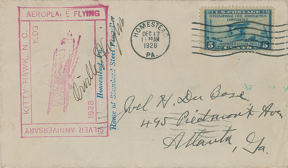 Mailing envelope bearing a stamped cachet honoring the silver anniversary of man's first flight at Kitty Hawk, 6 x 3.5, postmarked at Homestead, Pennsylvania, on December 17, 1928 signed in black ink by the younger Wright brother. In fine condition.