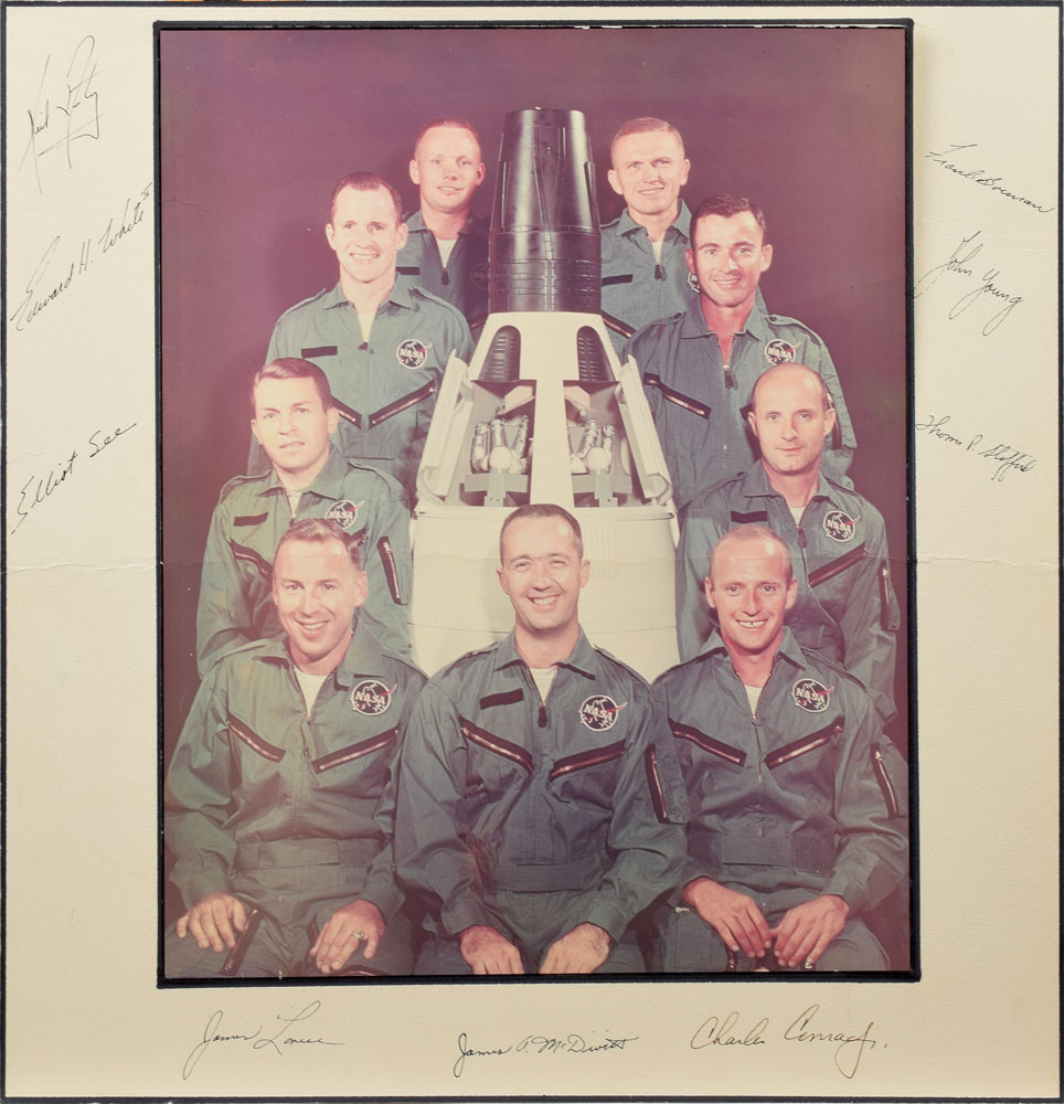 Vintage color glossy 11 x 13.75 photo of NASA’s Astronaut Group 2, also referred to as ‘The New Nine,’ proudly posing with a large model of the Gemini capsule, affixed to its original 15.5 x 16 mount, signed on the mount adjacent to their respective images in black ink, “Neil Armstrong,” “Edward H. White II,” “Elliot See,” “James Lovell,” “James A. McDivitt,” “Charles Conrad, Jr.,” “Thomas P. Stafford,” “John Young,” and “Frank Borman.” In very good condition, with a central horizontal crease through image and mount (not affecting any of the signatures but passing through the heads of Lovell, McDivitt, and Conrad), top right corner of photo separating from mount, a few other light creases and surface marks. Selected in 1962, the Group 2 appointments expanded the number of astronauts from 7 to 16 as NASA moved on to Projects Gemini and Apollo. With the exception of See, each pictured astronaut flew in the Gemini mission; See was killed in a crash on February 28, 1966, while flying a T-38 jet trainer to the McDonnell Aircraft plant for inspection. His copilot, Charles Bassett, was also killed; both men were slated as the original Gemini 9 crew. Ed White, who is pictured immediately above See, tragically perished in the Apollo 1 fire less than two years after his Gemini 4 mission. Consignor notes that the photo originates from the family collection of Ed White.