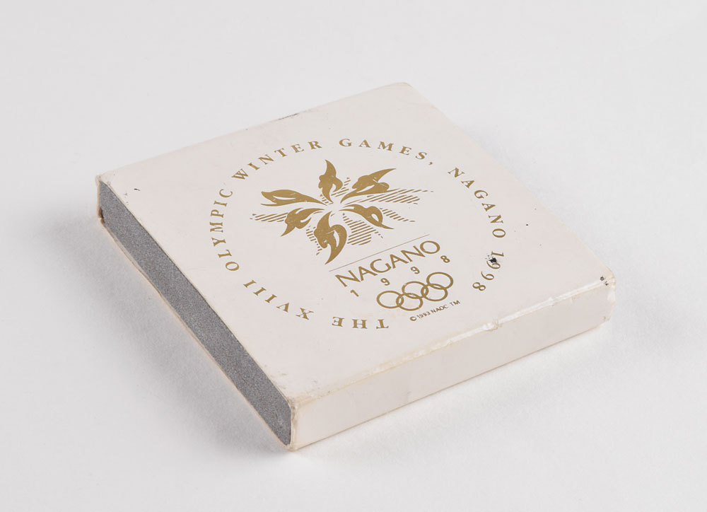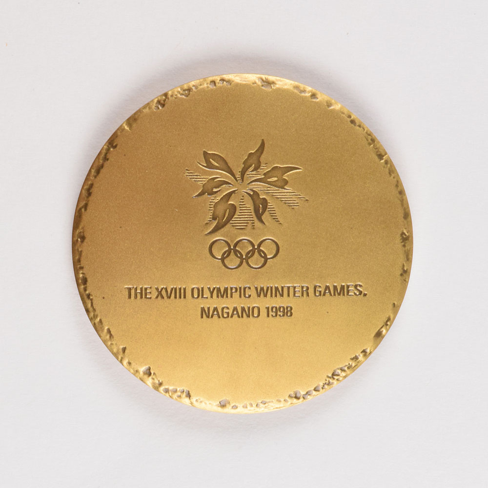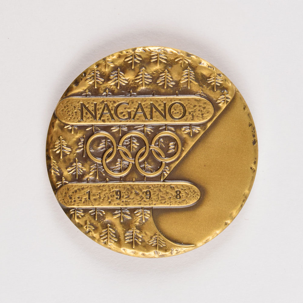 Beautiful participation medal issued for the Nagano 1998 Winter Olympics. Bronze, 60 mm, 120 gm. The front features a forest of small trees on a mountain side with a curve denoting a ski slope; the reverse bears the Nagano Games logo and a wreath effect along the rim. Includes its original white paper sleeve with foam holder.