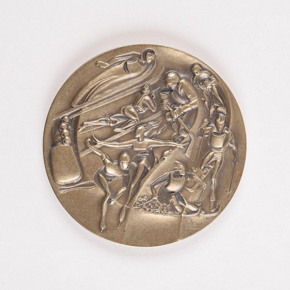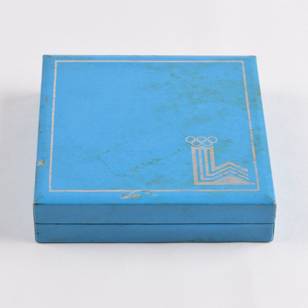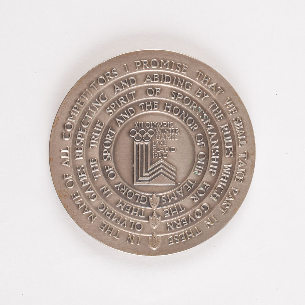 Participation medal issued for the Lake Placid 1980 Winter Olympics. Nickel-silver, 76 mm, 202 gm, by Marcel Jovine/Neil Kennedy. The front depicts modern relief views of the nine winter sports; the reverse bears the Lake Placid Games emblem encircled by the raised words of the Olympic oath in four concentric circles. Complete with its original blue box, which exhibits scattered soiling to the exterior.