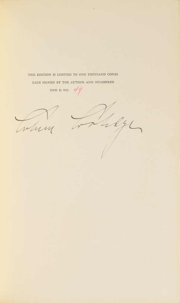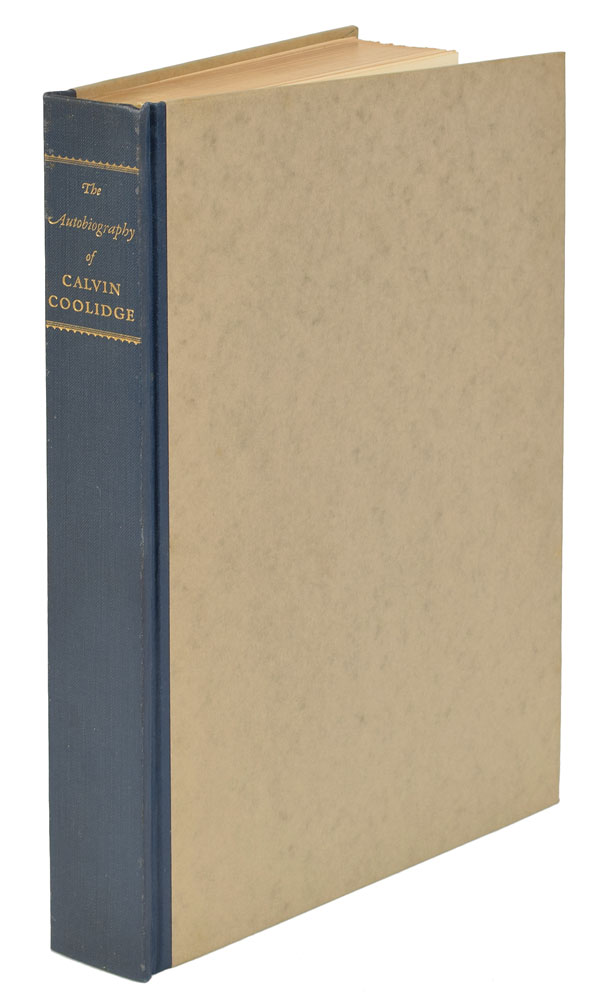 Signed book: The Autobiography of Calvin Coolidge. First edition, limited issue, numbered 49/1000. NY: Cosmopolitan Book Corporation, 1929. Hardcover with slipcase, 6.25 x 9.5, 247 pages. Boldly signed on the colophon in fountain pen by Coolidge. Autographic condition: very fine. Book condition: VG+/None in a G+ slipcase, with dampstaining to exterior of slipcase and some chipping to label.