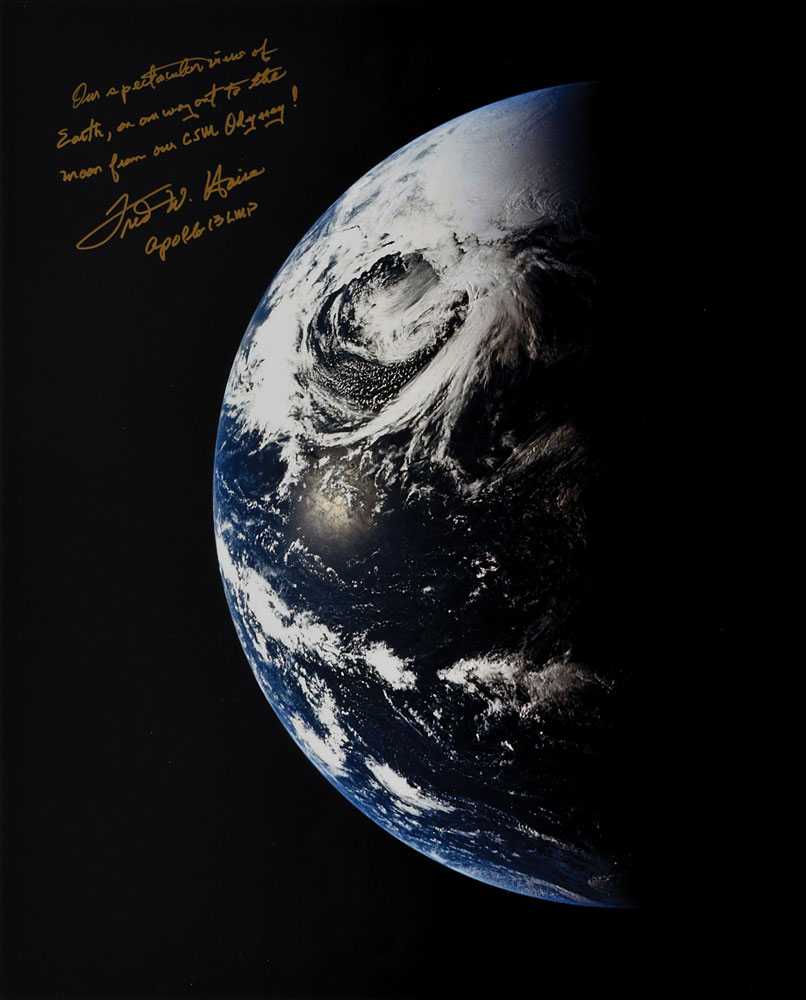 Fantastic color semi-glossy 16 x 20 vertical photo of the Earthrise, signed in gold ink, "Our spectacular view of Earth, on our way out to the moon from our CSM Odyssey! Fred W. Haise, Apollo 13 LMP.” In fine condition.
